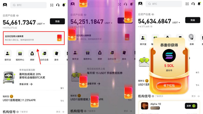 · 按首页提示点击「红包」,即可获得随机数量的热门代币奖励;